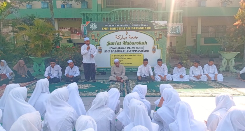 SMP Babussalam Pekanbaru kembali melaksanakan kegiatan Jumat Mubarokah pada hari ini di halaman sekolah dengan penuh khidmat. Kegiatan rutin pekanan ini diisi oleh Ustaz Rahmadin Fajri,
