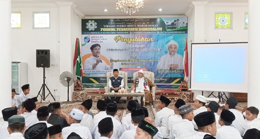 Pekanbaru, 20 November 2023 - Pondok Pesantren Babussalam Pekanbaru menjadi saksi dari kehadiran Prof. Dr. Ridha Dharmajaya, seorang inisiator Gerakan Gadget Sehat Indonesia (GGSI), dalam menyelenggarakan seminar berjudul "Penyelamatan Generasi Bangsa Indonesia Menuju Indonesia Emas 2045". Acara berlangsung di Gedung Haji Ahmad Royan pada Senin, 20 November 2023, ba'da zuhur.
