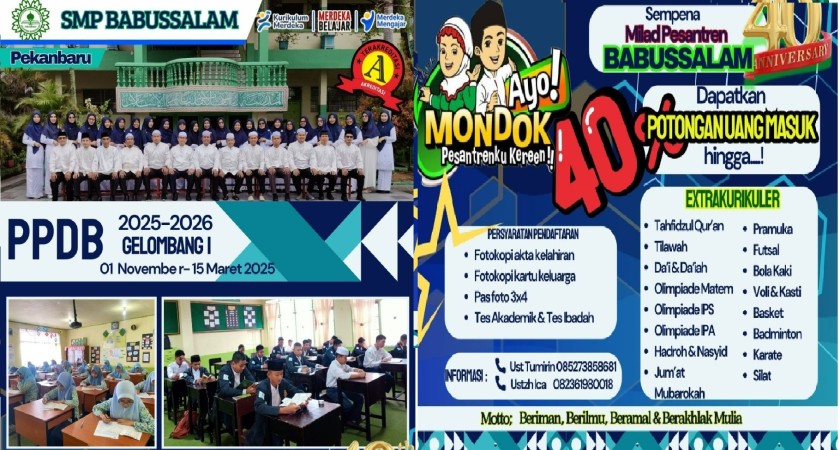SMP Babussalam Pekanbaru masih membuka Penerimaan Peserta Didik Baru (PPDB) Gelombang I untuk tahun ajaran 2025-2026. Pendaftaran dibuka hingga 15 Maret 2025.