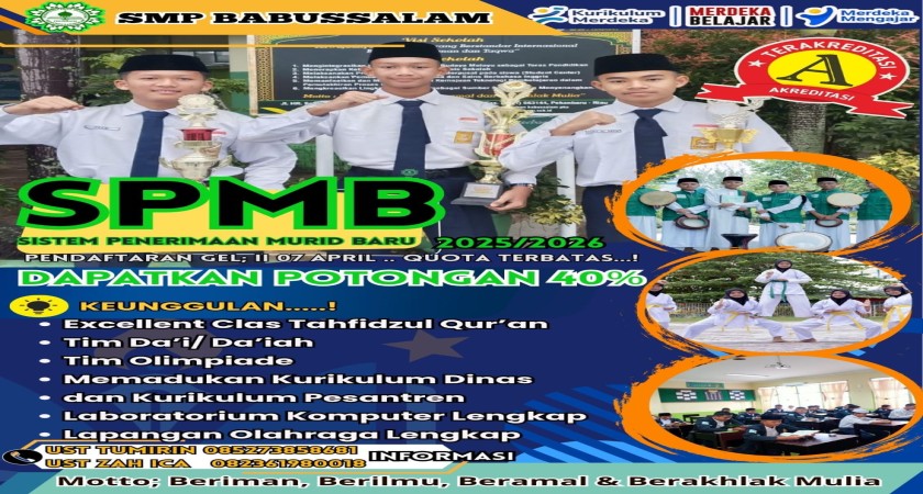 SMP Babussalam membuka Penerimaan Murid Baru (SPMB) Gelombang II mulai sejak tanggal 07 April 2025.